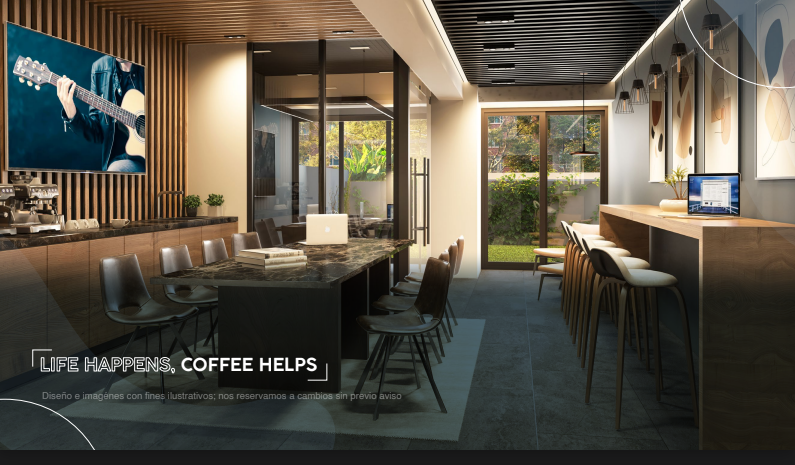 Las amenidades que ofrece están: Coffe station, coworking space, business center, gimnasio, piscina, sun deck, firepit rooftop y BBQ terrace.